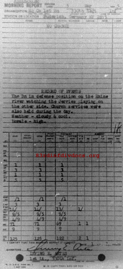 The Bn in defense position on the Rhine river watching the Jerries playing on the other side. Church services were also held during the day. Weather - cloudy & cool. Morale - high.