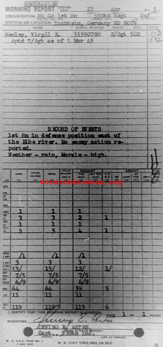 1st Bn in defense position east of the Elbe river. No enemy action reported. Weather - good. Morale - high.