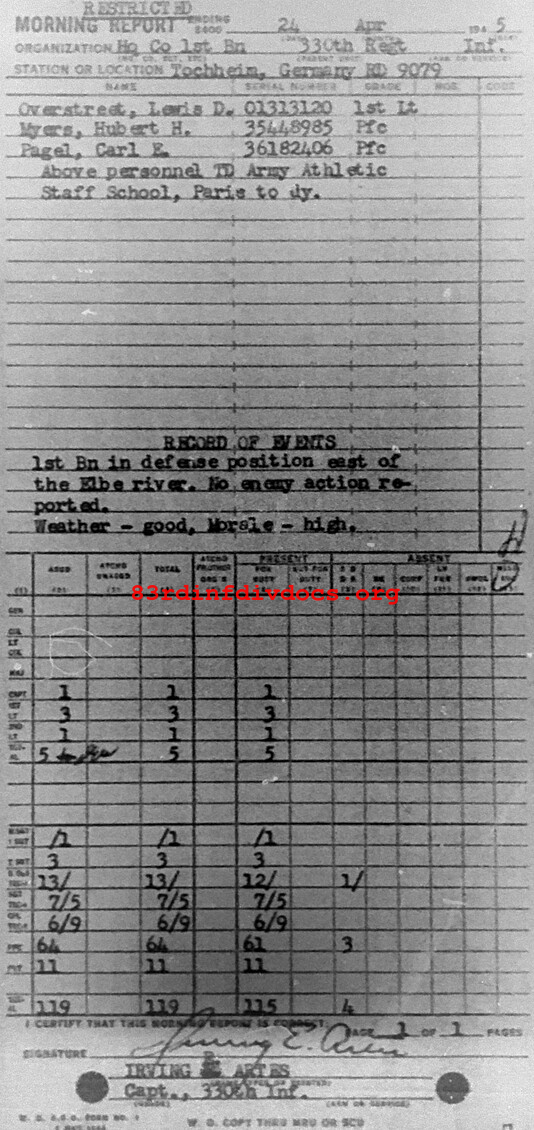 1st Bn in defense position east of the Elbe river. No enemy action reported. Weather - good. Morale - high.
