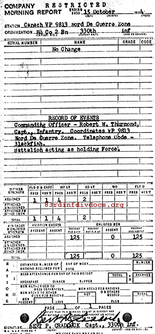 Commanding Officer - Roberd W. Thurmond Capt., Innfantry. Coordinates vP9813, NdG. Telephone Code - Blackfish. Battalion acting as holding Force.
