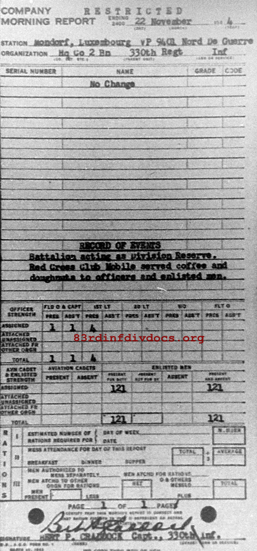 Battalion acting as Division Reserve. Red Cross Club Mobile served coffee and doughnuts to officers and enlisted men.