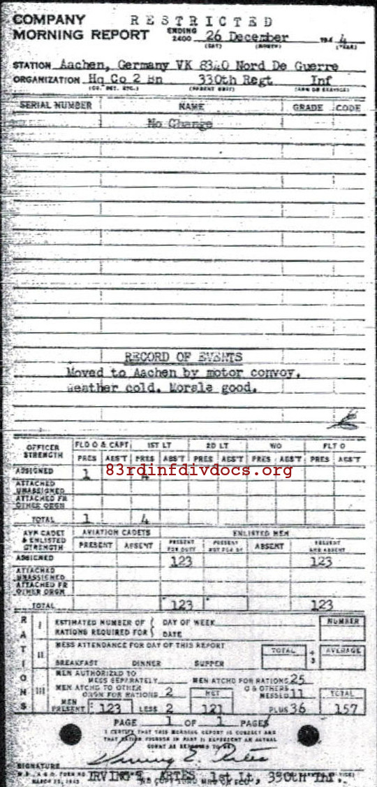 Moved to Aachen by motor convoy. Weather cold. Morale good.