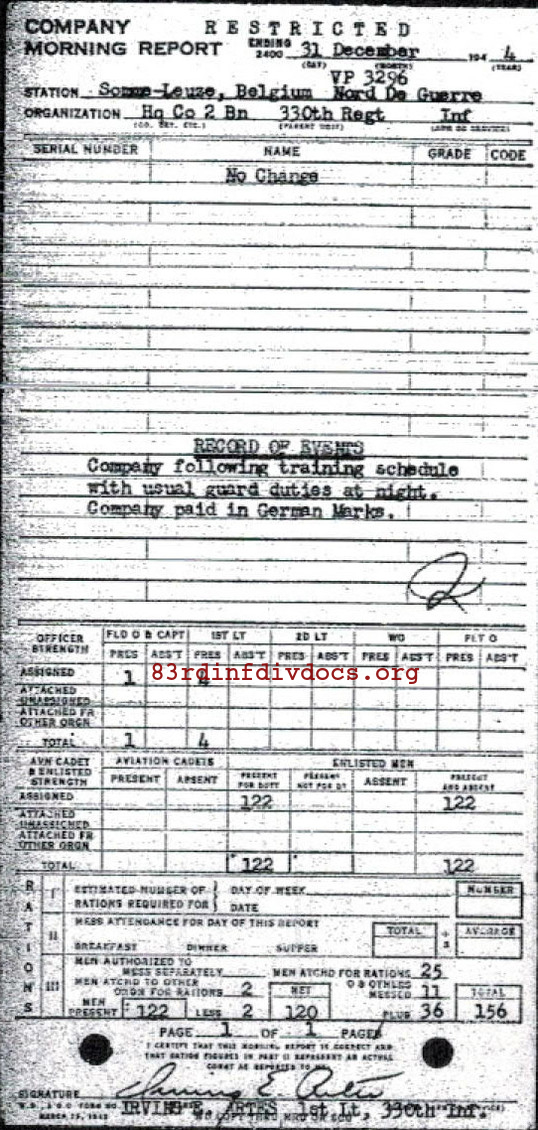Company following training schedule with usual guard duties at night. Company paid in German Marks.