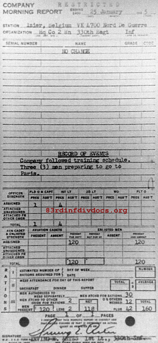 Company followed training schedule. Three (3) men preparing to go to Paris.