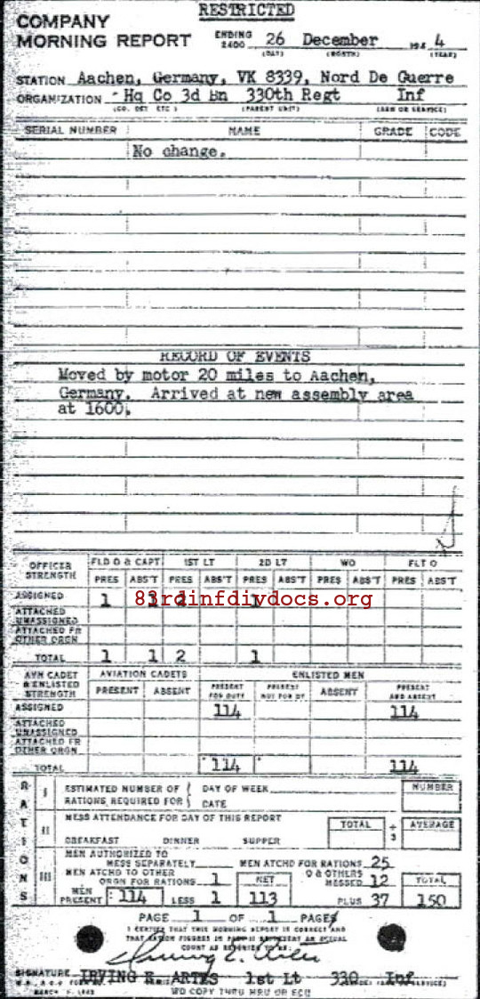 Moved by motor 20 miles to Aachen, Germany. Arrived at new assembly at 1600.