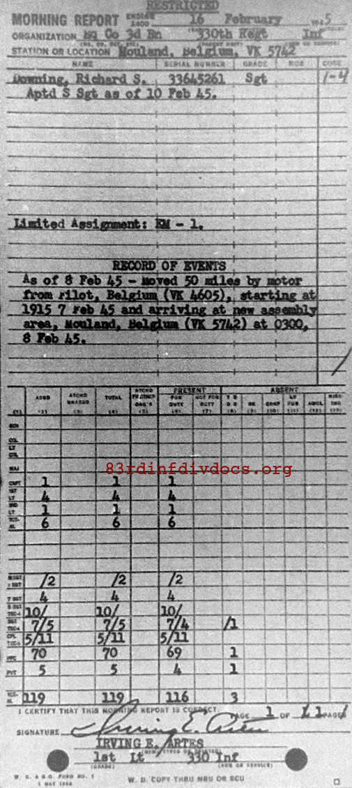 As of 8 Feb 45 - Moved 50 miles by motor from Filot, Belgium (vK4605), starting at 1915 7 Feb 45 and arriving at new assembly are, Mouland, Belgium (vK5742) at 0300, 8 Feb 45.