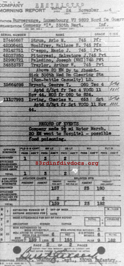 Company made 9 1/2 mi Motor March. 20 EM went to Hospital - possible food poisoning.