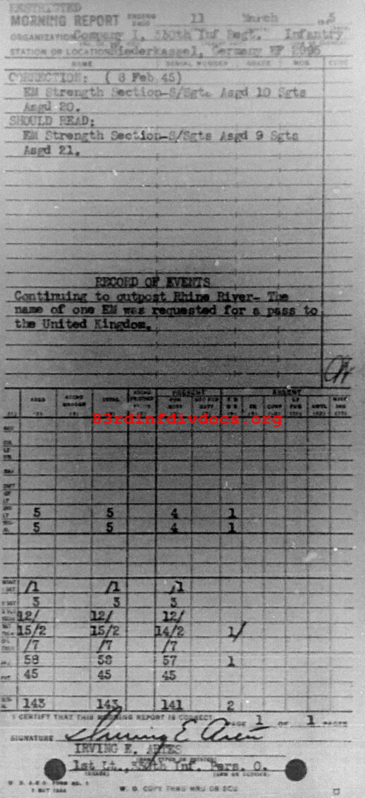 Continuing to outpost Rhine River - The name of one EM was requested for a pass to the United Kingdom.