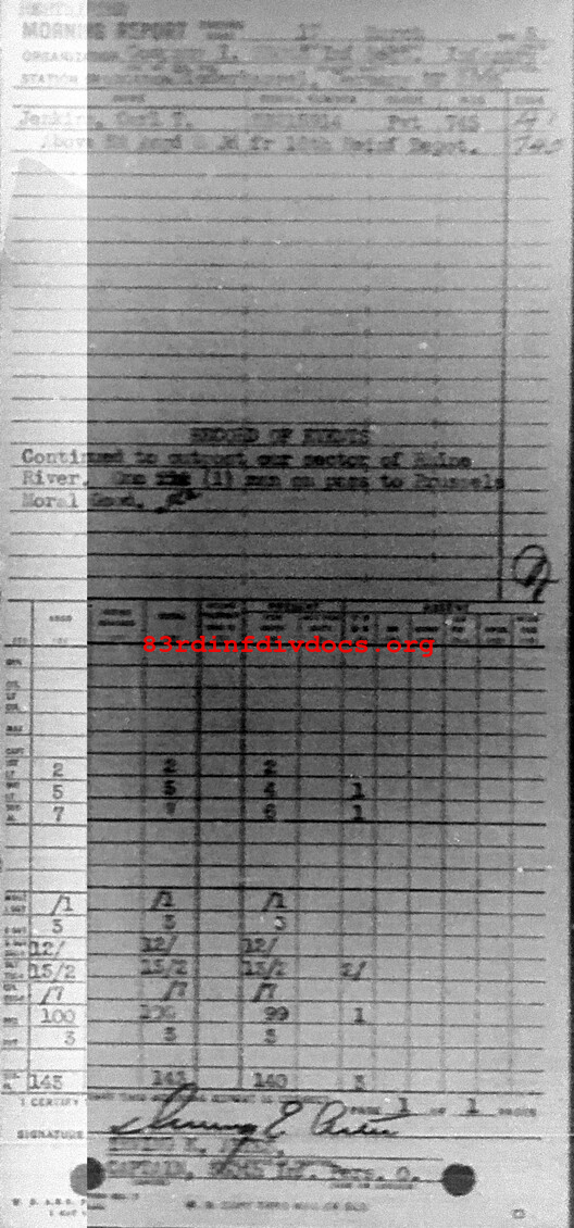 Continued to outpost our sector of Rhine River. One (1) man on pass to Brussels. Moral Good.