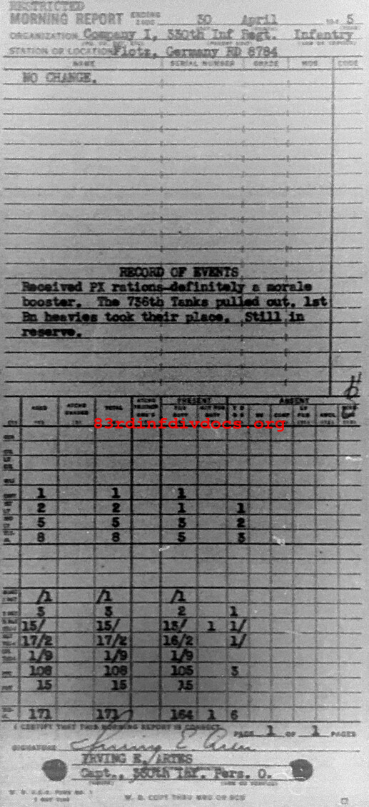 Received PX rations - definitely a morale booster. The 736th Tanks pulled out. 1st Bn heavies took their place. Still in reserve.