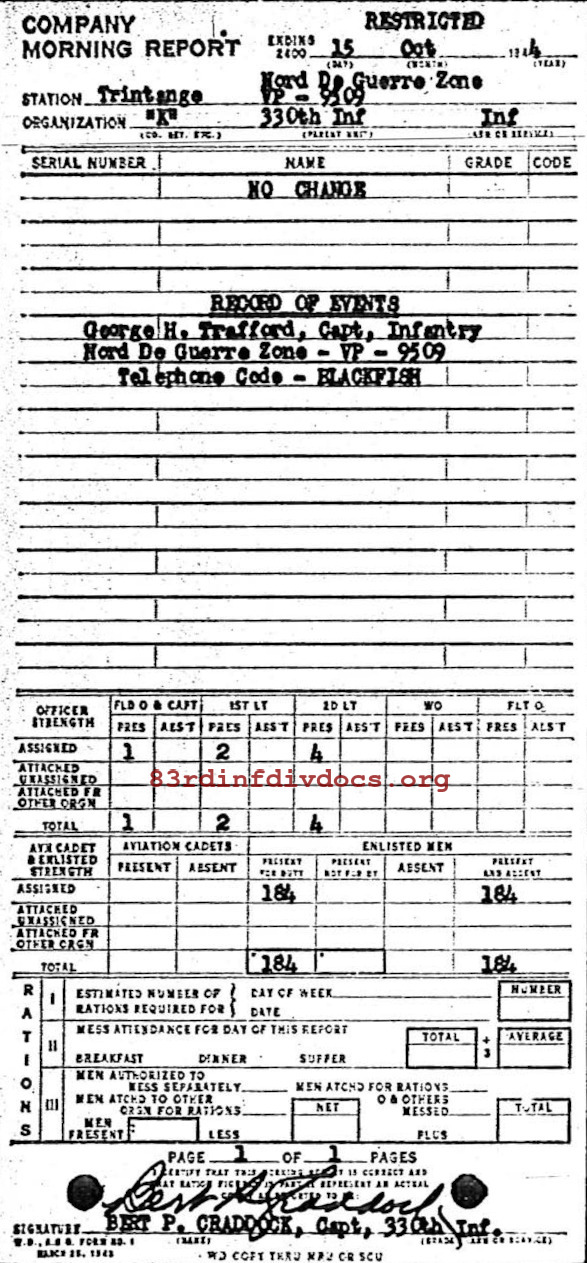 George H. Trafford, Capt, Infantry. NdG vP9509. Telephone Code - Blackfish.