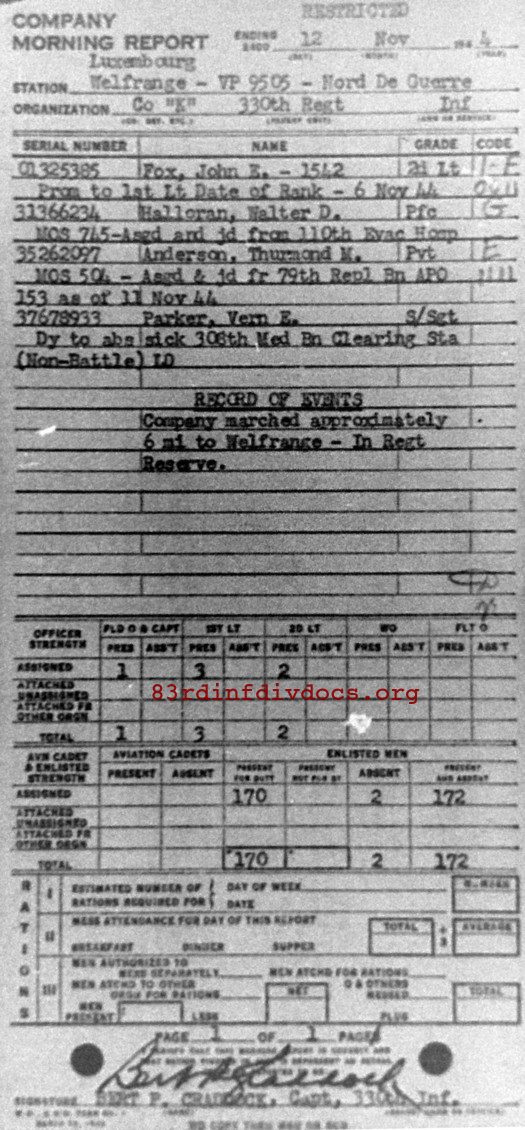 Company marched approximately 6 mi to Welfrange - In Regt Reserve.