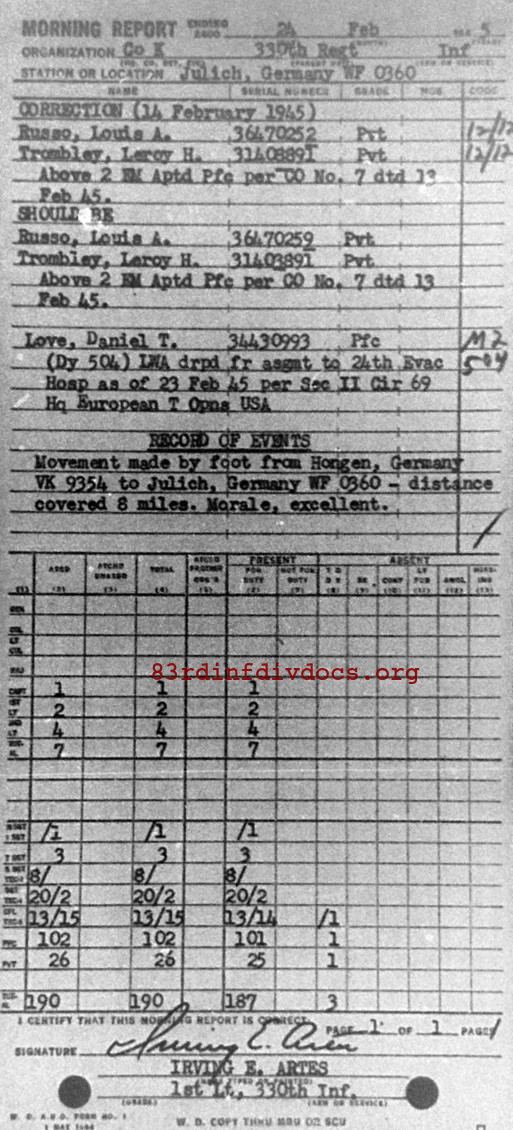 Morning report K/330 for February 24, 1945
