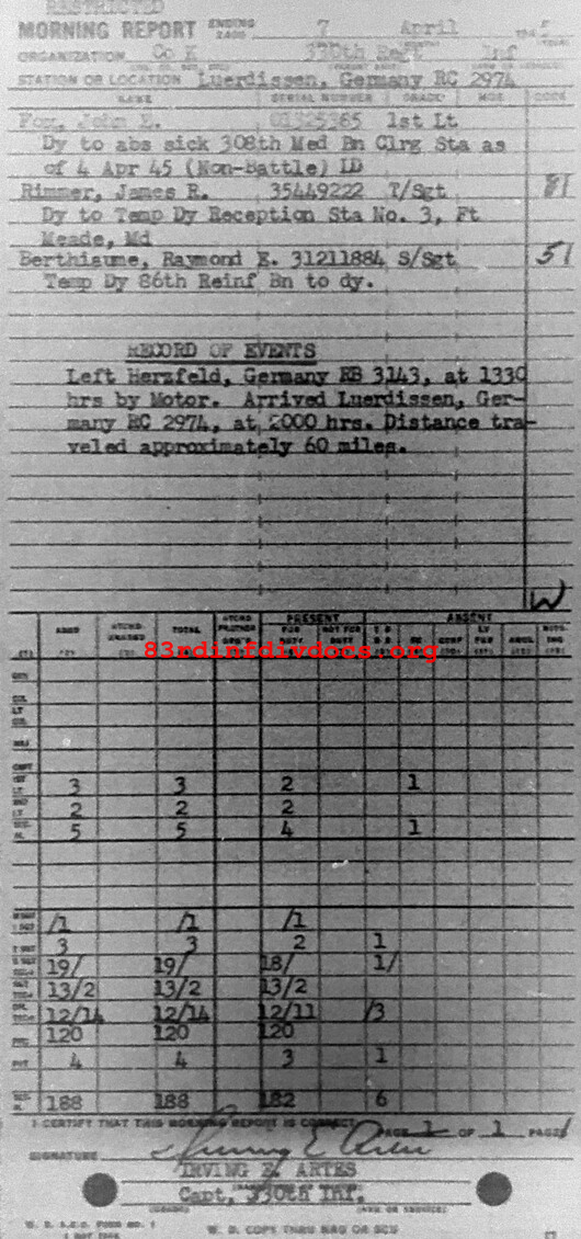 Left Herzfeld, Germany rB3143, at 1330 hrs by Motor. Arrived Luerdissen, Germany rC2974, at 2000 hrs. Distance traveled approximately 60 miles.