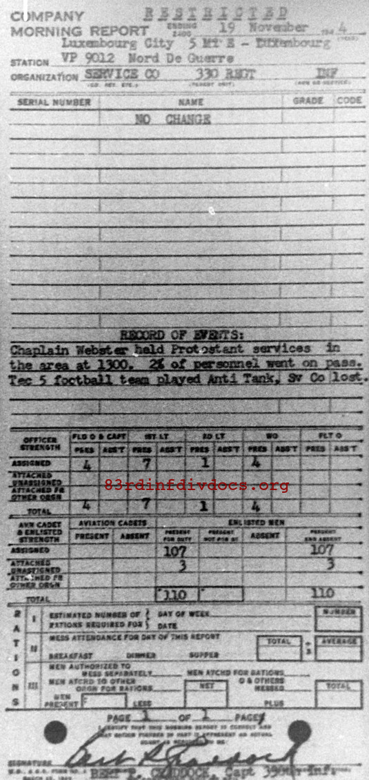 Chaplain Webster held Protestant services in the area at 1300. 2% of personnel went on pass. Tec 5 football team played Anti Tank, Sv Co lost.