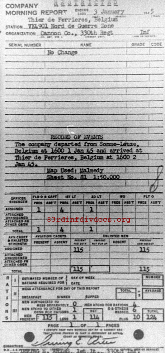 The company departed from Somme-Leuze, Belgium at 1600 1 Jan 45 and arrived at Thier de Ferrieres, Belgium at 1600 2 Jan 45.