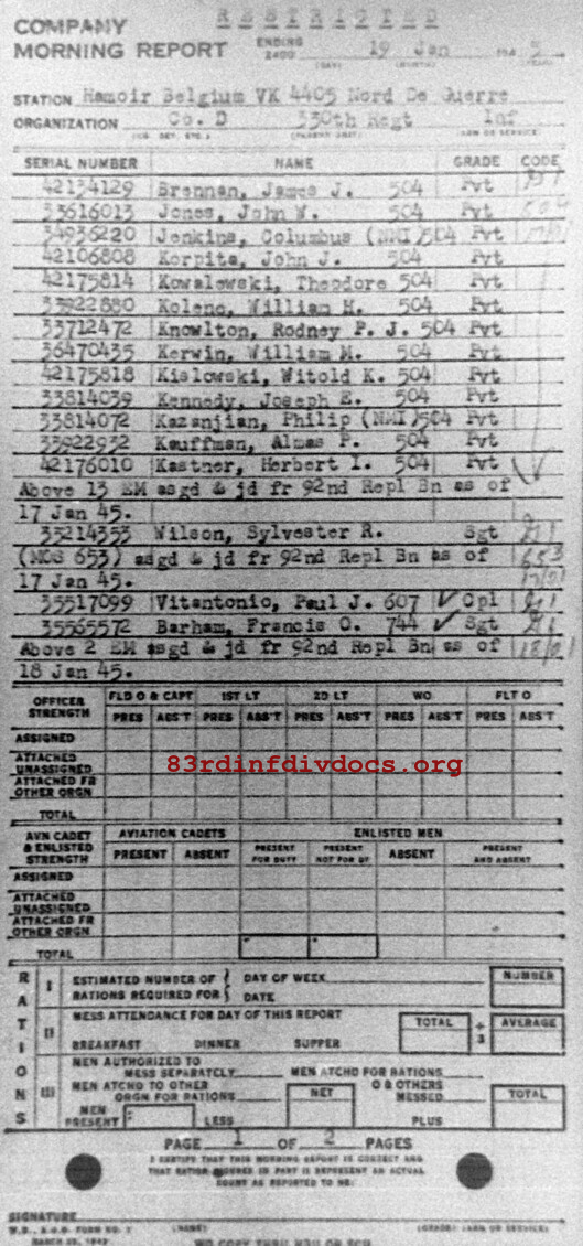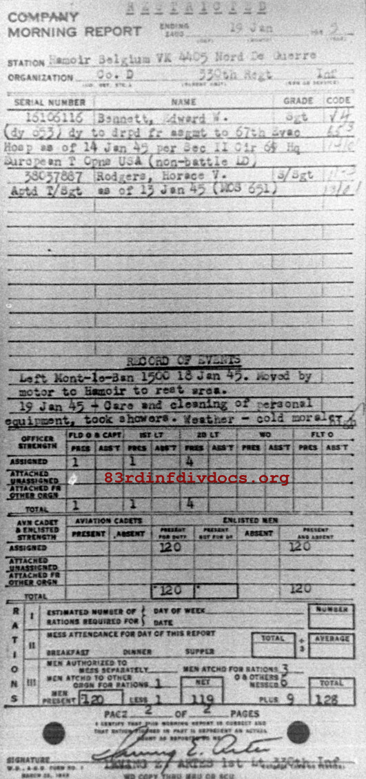 Left Mont-le-Ban 1500 18 Jan 45. Moved by motor to Hamoir to rest area. 19 Jan 45 - Care and cleaning of personal equipment, took showers. Weather - cold. Morale - high.