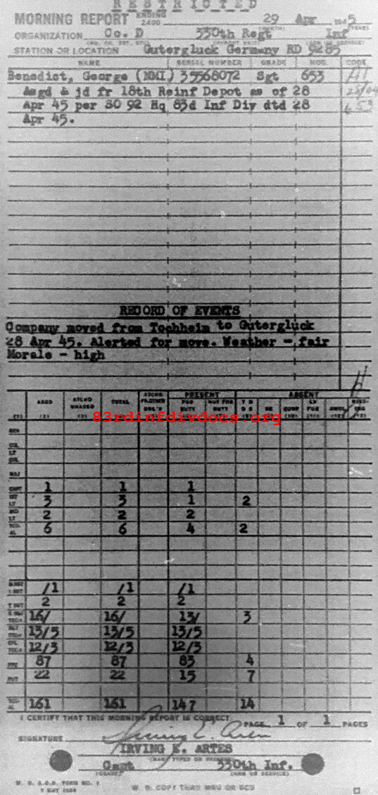 Company moved from Tochheim to Gutergluck 28 Apr 45. Alerted for move. Weather - fair. Morale - high