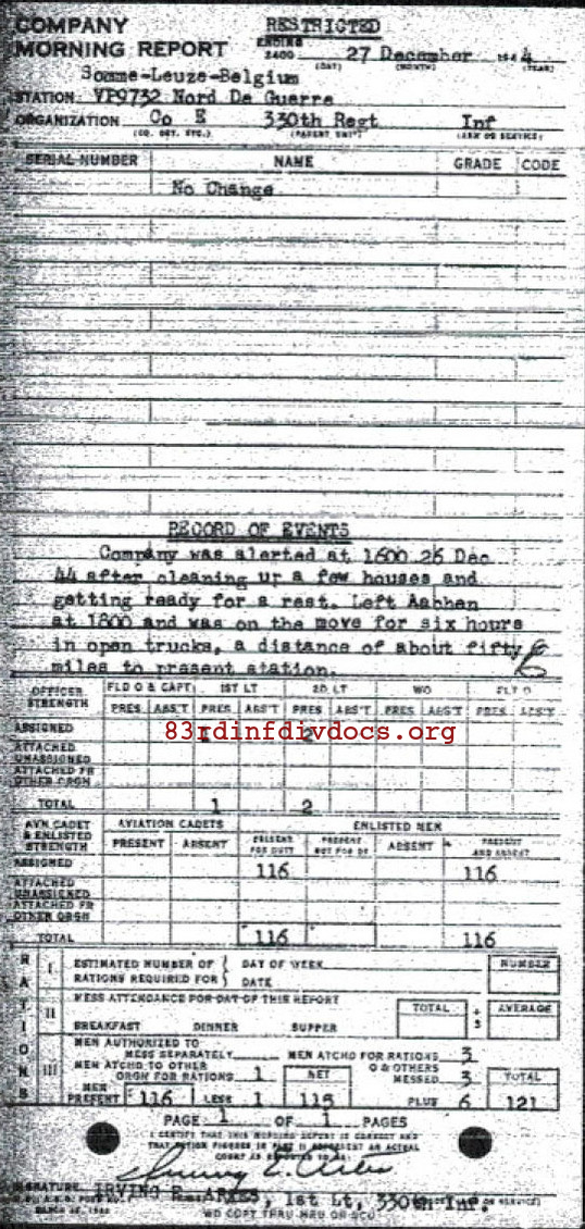 Company was alerted at 1600 26 Dec 44 after cleaning out a few houses and getting ready for a rest. Left Aachen at 1800 an was on the move for six hours in open trucks, a distance of about fifty miles to present location.