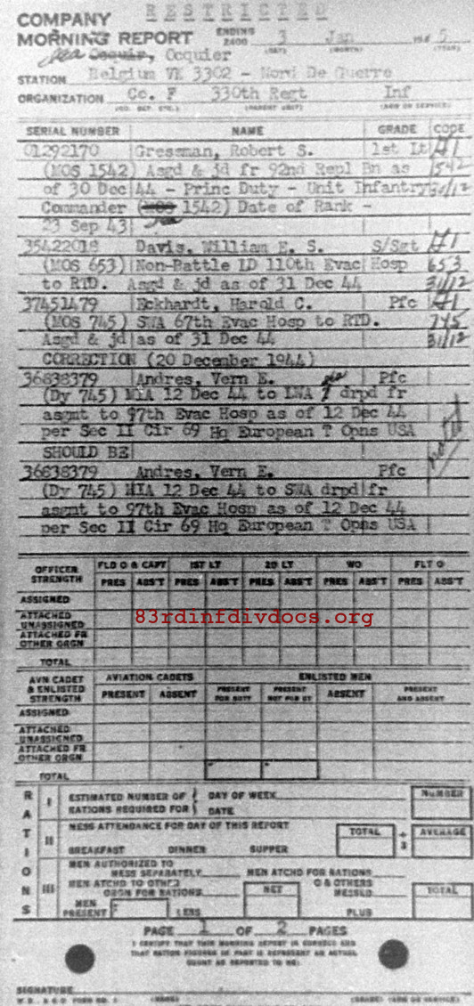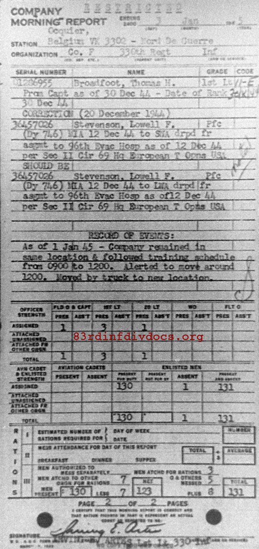 As of 1 Jan 45 - Company remained in same location & followed training schedule from 0900 to 1200. Alerted to move around 1200. Moved by truck to new location.