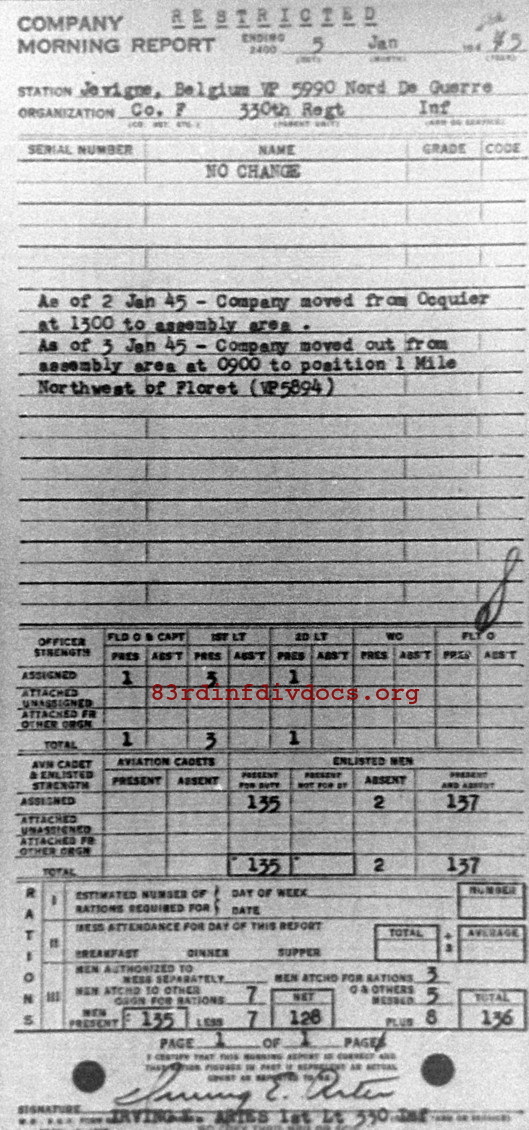 As of 2 Jan 45 - Company moved from Ocquier at 1300 to assembly area. As of 3 Jan 45 - Company moved out from assembly area at 0900 to position 1 Mile Northwest of Floret (vP5894).