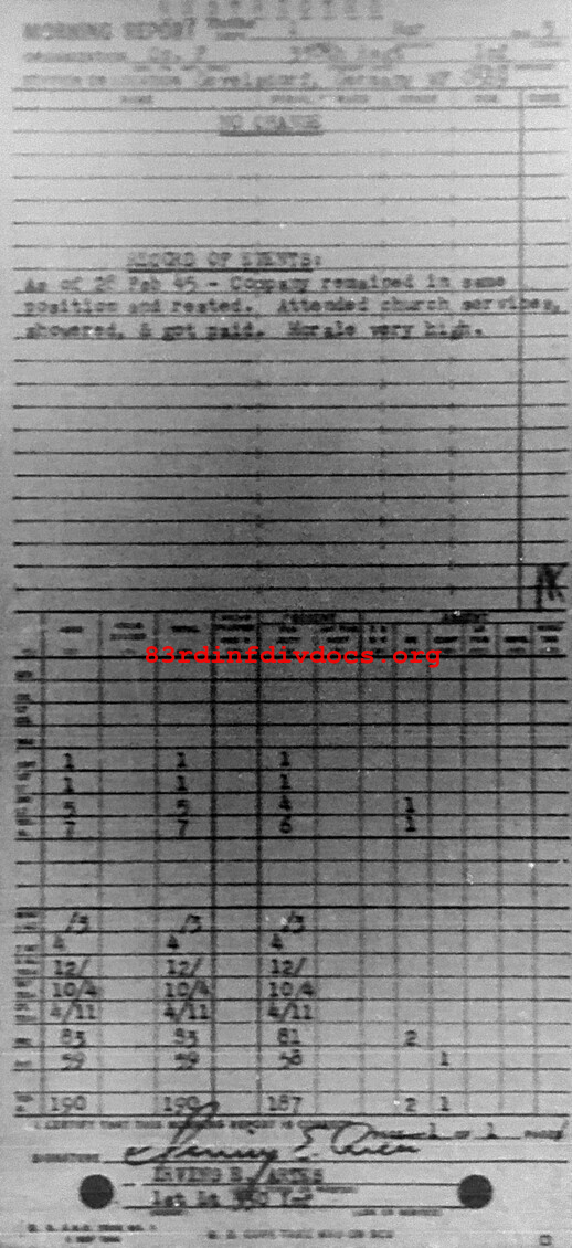 As of 28 Feb 45 - Company remained in same position and rested. Attended church services, showered & got paid. Morale very high.