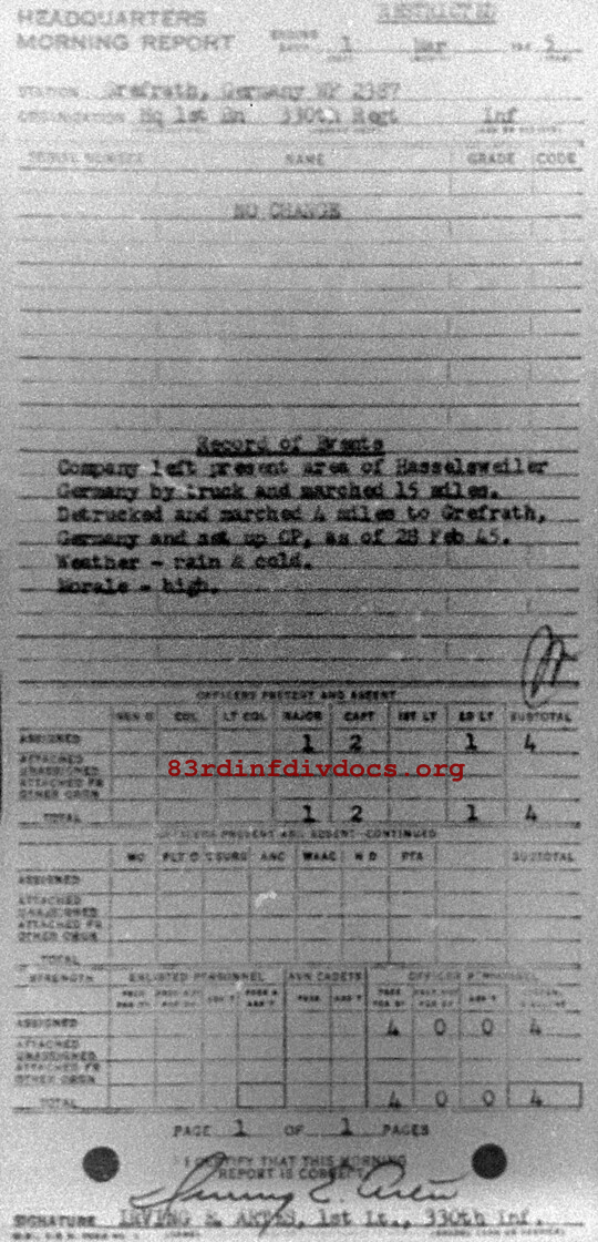 Company left present area of Hasselsweiler, Germany by truck and marched 15 miles. Detrucked and marched 4 miles to Grefrath, Germany and set up CP, as of 28 Feb 45. Weather - rain & cold. Morale - high.