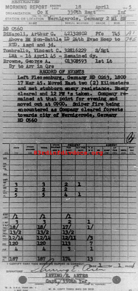 Left Plessenburg, Germany rD0263, 1800 17 Mar 45. Moved East two (2) Kilometers and met stubborn enemy resistance. Enemy cleared and 12 PW's taken. Company remained at that point for evening and moved out at 0900. Sniper fire being encountered as Company cleared forests towards city of Wernigerode, Germany rD0560.