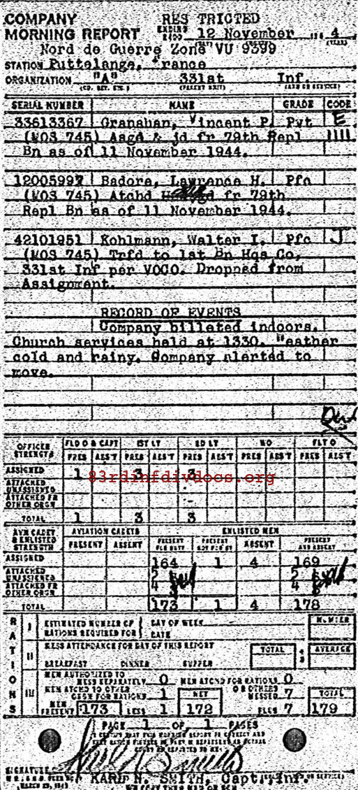 Company billeted indoors. Church services held at 1330. Weather cold and rainy. Company alerted to move.