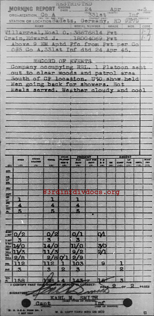 Company occupying RRL. 1 Platoon sent out to clear woods and patrol area South of CP location. USO show held. Men going back for showers. Hot Meals served. Weather cloudy and cool.