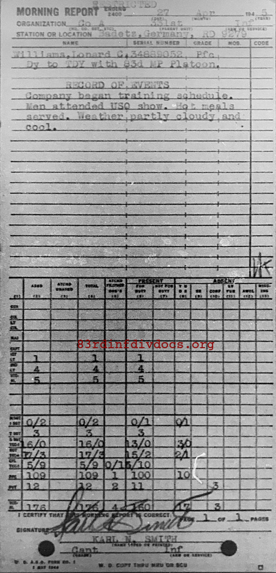 Company began training schedule. Men attended USO show. Hot meals served. Weather partly cloudy and cool.