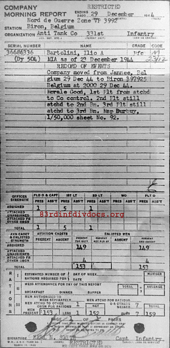 Company moved from Jannee, Belgium 29 Dec 44 to Biron 397925 Belgium at 2000 29 Dec 44. Morale Good. 1st Plt from atchd to Co control, 2nd Plt still atchd to 2nd Bn. 3rd Plt still atchd to 3rd Bn.