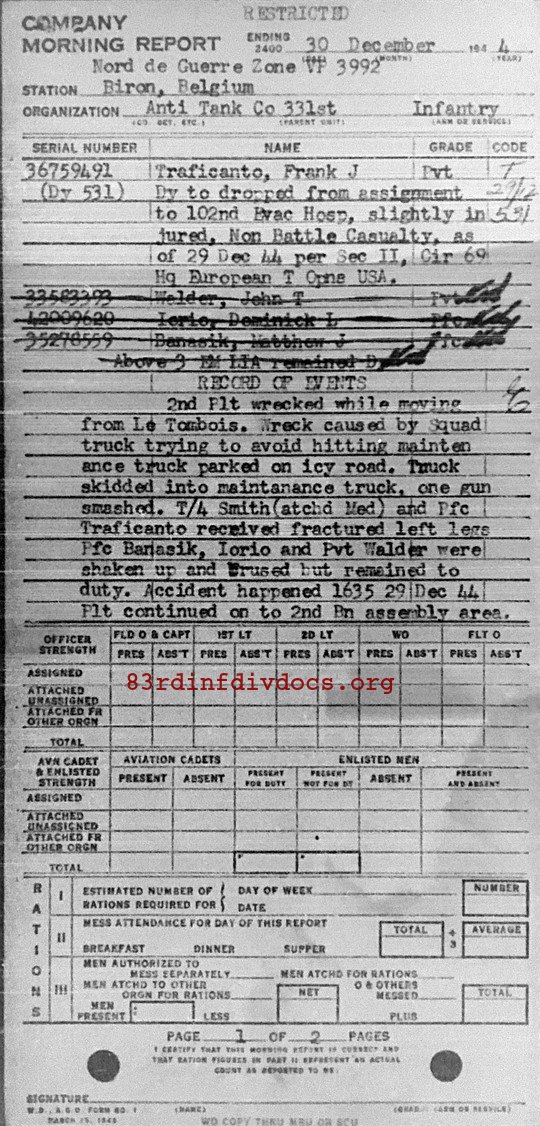 2nd Plt wrecked while moving from Le Tombois. Wreck caused by Squad truck trying to avoid hitting maintenance truck parked on icy road. Truck skidded into maintenance truck, one gun smashed. T/4 Smith (atchd Med) and Pfc Traficanto received fractured left legs. Pfc Banasik, Iorio and Pvt Walder were shaken up and brused but remaind to duty Accident happened 1635 29 Dec 44. Plt continued to 2nd Bn assembly area. and stayed over night 30 Dec 4 the plt set up the 2 remaining guns in Soy. 3rd plt set up position in the town of Ny. 1st Plt set up position in Fisenne. Position set up by gun positions were ordered by Bns.