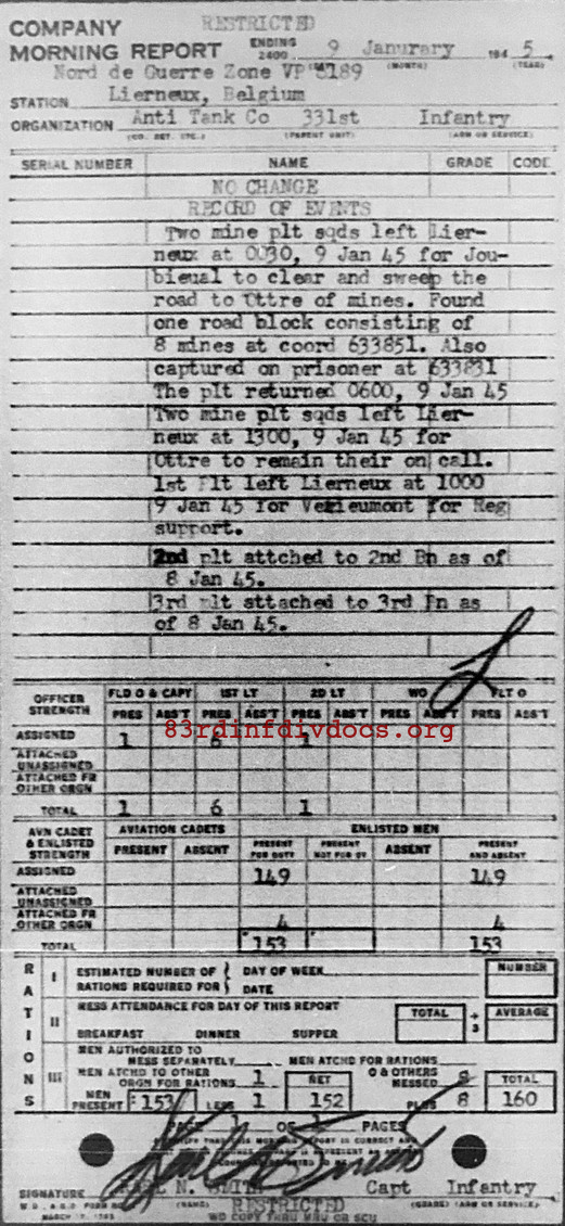 Two mine plt sqds left Lierneux at 0030, 9 Jan 45 for Joubieual to clear and sweep the road to Ottre of mines. Found one road block consisting of 8 mines at coord 633851. Also captured on prisoner at 633831. The plt returned 0600, 9 Jan 45. Two mine plt sqds left Lierneux at 1300, 9 Jan 45 for Ottre to remain their on call. 1st Plt left Lierneux at 1000 9 Jan 45 for Vekieumont for Reg support. 2nd plt attached to 2nd Bn as of 8 Jan 45. 3rd plt attached to 3rd Bn as of 8 Jan 45.