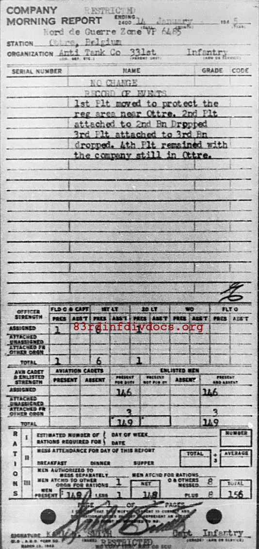 1st Plt moved to protect the reg area near Ottre. 2nd Plt attached to 2nd Bn Dropped. 3rd Plt attached to 3rd Bn dropped. 4th Plt remained with the company still in Ottre.