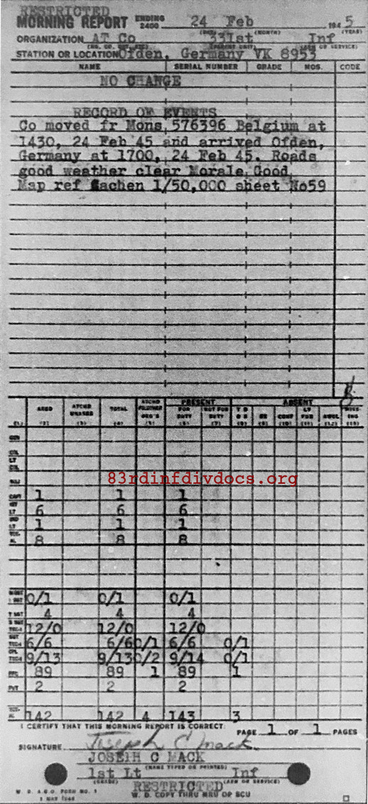 Co moved fr Mons, 576396 Belgium at 1430, 24 Feb 45 and arrived Ofden, Germany at 1700, 24 Feb 45. Roads good weather clear Morale Good.