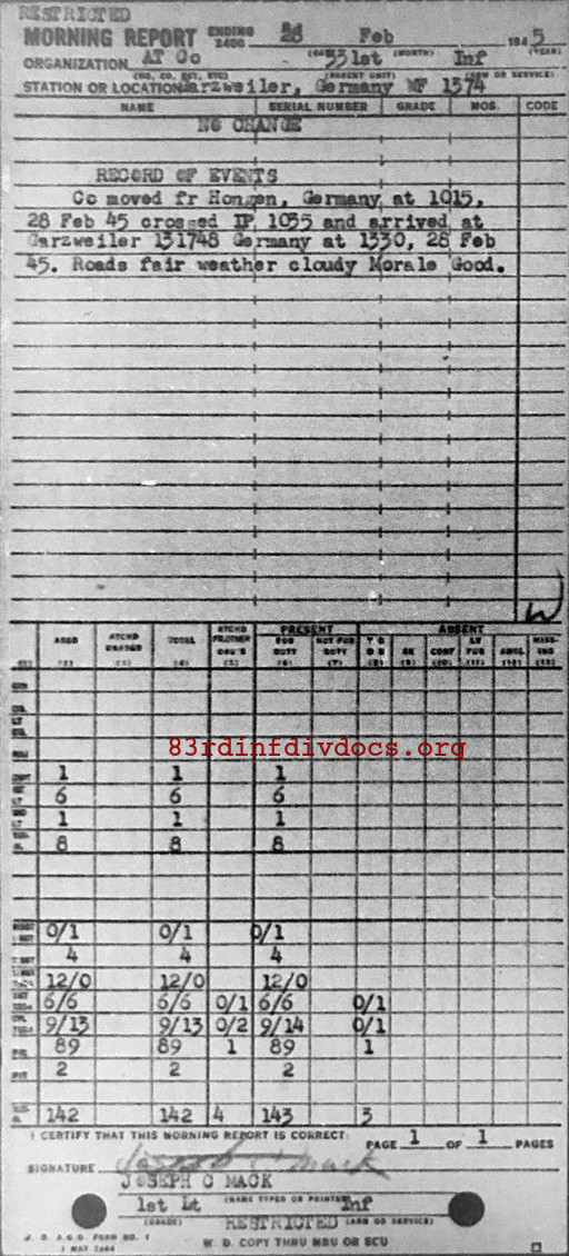 Co moved fr Hongen, Germany at 1015. 28 Feb 45 crossed IP 1035 and arrived at Garzweiler 131748 Germany at 1330. 28 Feb 45. Roads fair weather cloudy Morale Good.