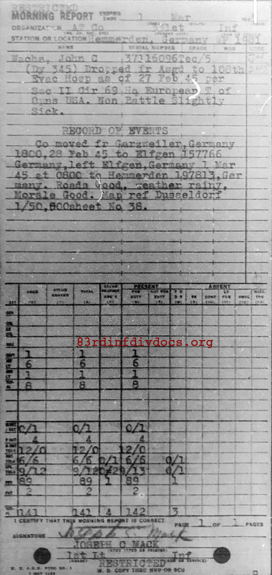 Co moved fr Garzweiler Germany 1800, 28 Feb 45 to Elfgen 157766 Germany, left Elfgen, Germany 1 Mar 45 at 0800 to Hemmerden 197813, Germany. Roads Good. Weather rainy, Morale Good.