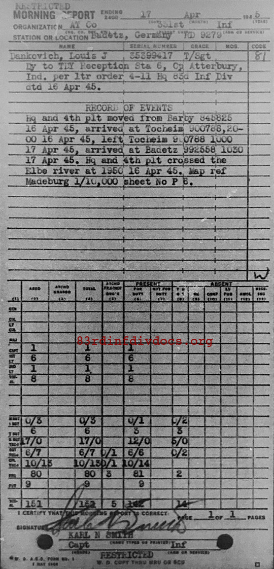 Hq and 4th plt moved from Barby 845825 16 Apr 45, arrived at Tocheim 900788, 2000 16 Apr 45, left Tocheim 900788 1000 17 Apr 45, arrived at Badetz 992558 1030 17 Apr 45. Hq and 4th plt crossed the Elbe river at 1850 16 Apr 45.