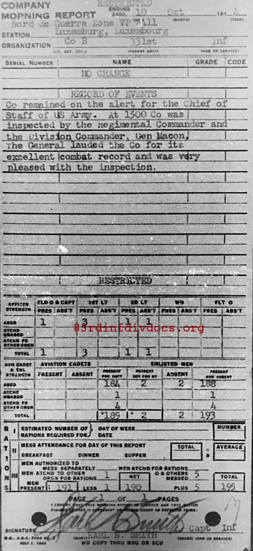 Co remained on the alert for the Chief of Staff of US Army. At 1500 Co was inspected by the Regimental Command and the Division Commander Gen Macon. The General lauded the Co for its excellent combat record and was very pleased with the inspection.