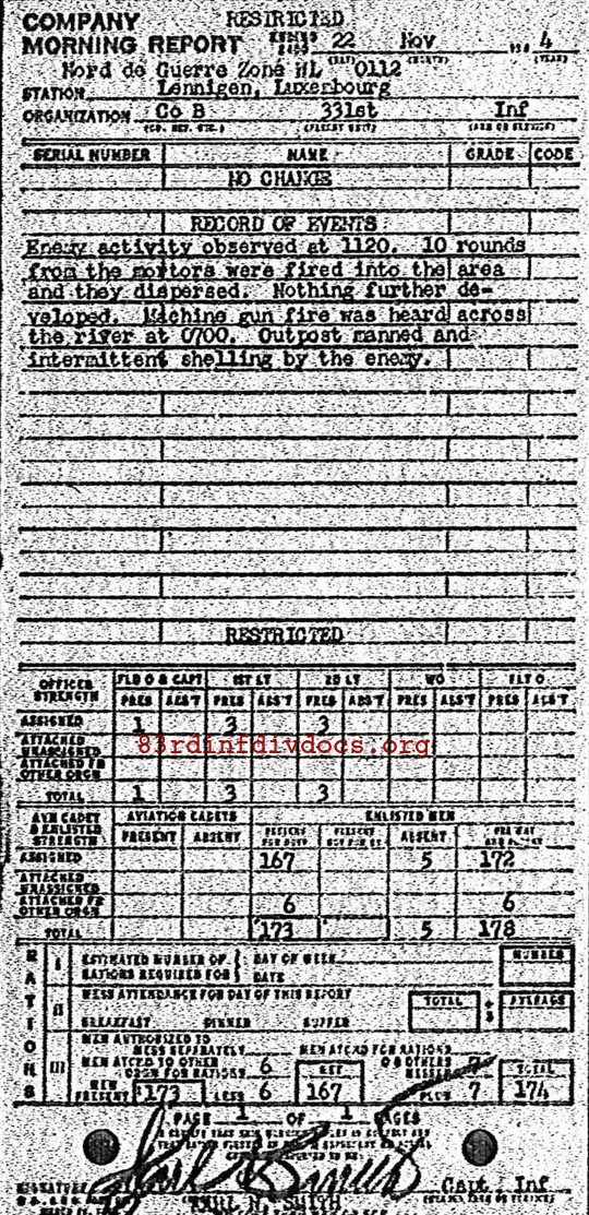 Enemy observed at 1120. 10 rounds from the mortars were fired into the area and they dispersed. Nothing further developed. Machine gun fire was heard across the river at 0700. Outpost manned and intermittent shelling by the enemy.