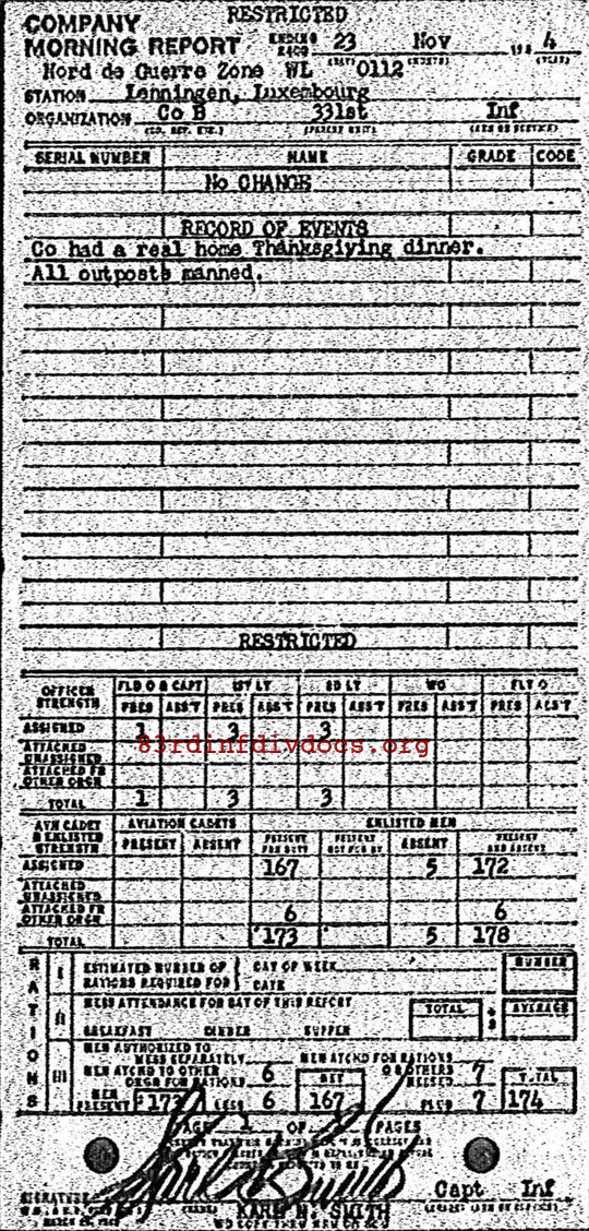 Co had a real home Thanksgiving dinner. All outposts manned.