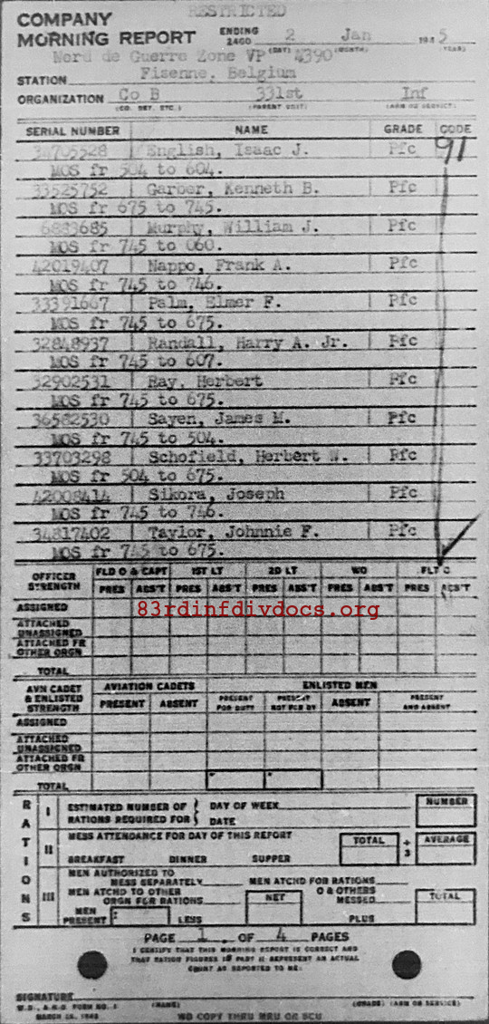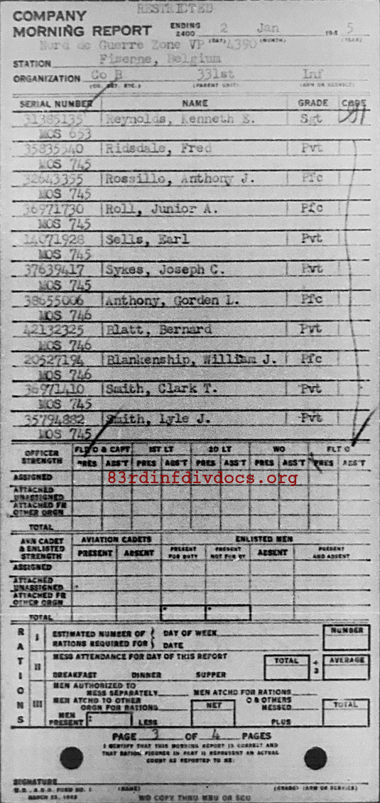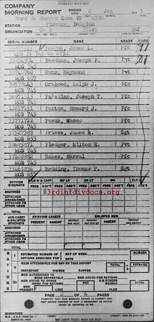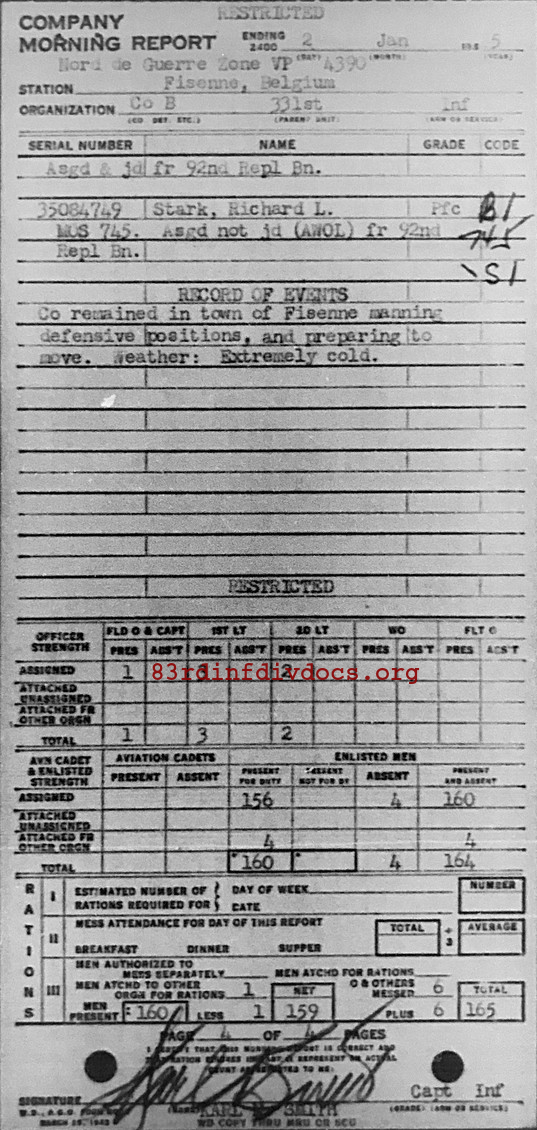 Co remained in town of Fisenne manning defensive positions, and preparing to move. Weather: Extremely cold.