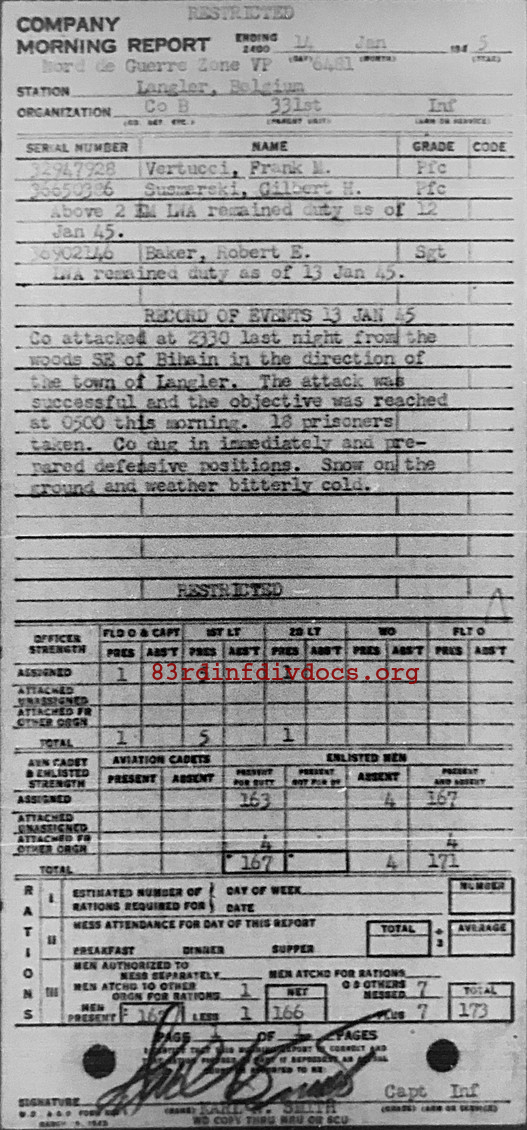 Record of events: 13 Jan 45 Co attacked at 2330 last night from the woods SE of Bihain in the direction of the town of Langler. The attack was succesful and the objective was reached at 0500 this morning. 18 prisoners taken. Co dug in immediately and prepared defensive positions. Snow on the ground and weather bitterly cold.