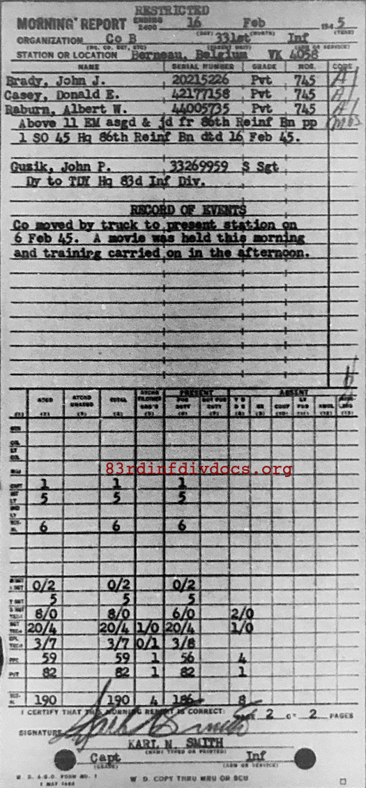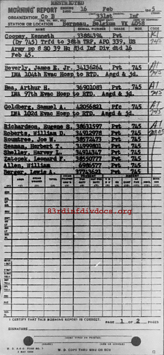 Morning report B/331 for February 16, 1945