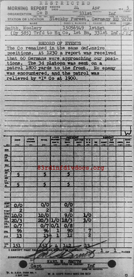 The Co remained in the same defensive positions. At 1230 a report was received that 60 Germans were approaching our positions. The 3d platoon was sent on a patrol 1800 yards to the front. No enemy was encountered, and the patrol was relieved by 'I' Co at 1900.