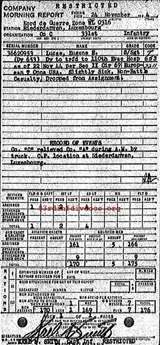 Co C relieved Co A during A.M by truck. C.P. location at Niederdanven, Luxembourg