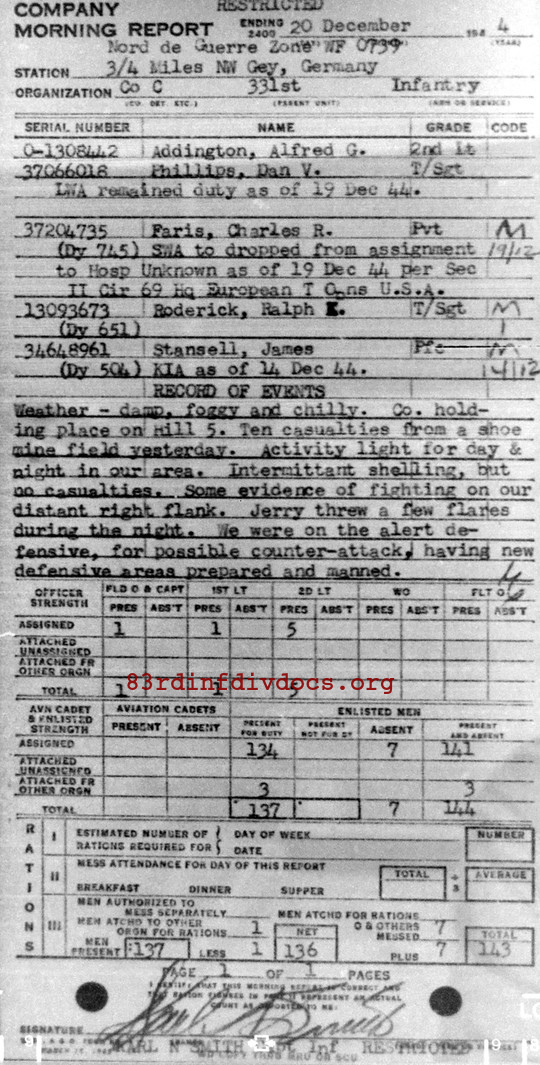 Weather - damp, foggy and chilly. Co. holding place on Hill 5. Ten casualties from a shoe mine field yesterday. Activity light for day and night in our area. Intermittant shelling but no casualties. Some evidence of fighting on our distant right flank. Jerry threw a few flares during the night. We were on the alert defensive, for possible counter-attack, having new defensive areas prepared and manned.