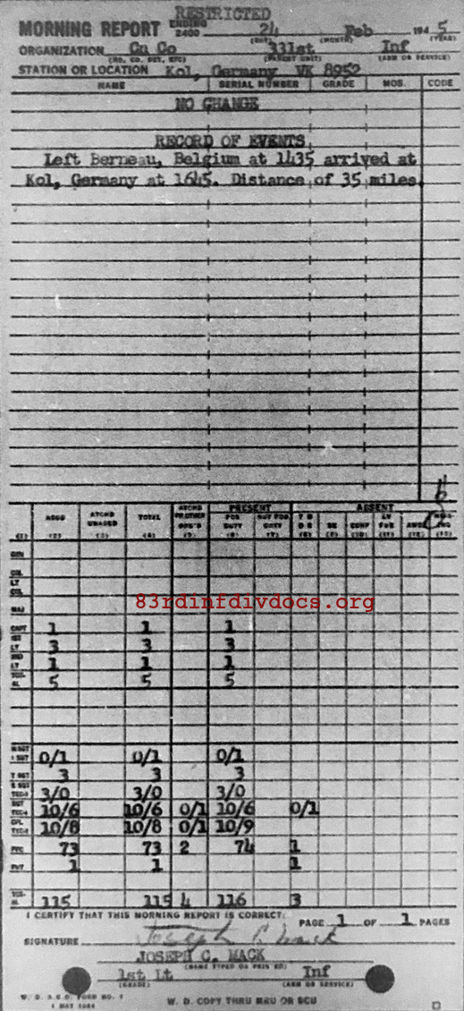 Left Berneau, Belgium at 1435 arrived at Kol, Germany at 1645. Distance of 35 miles.