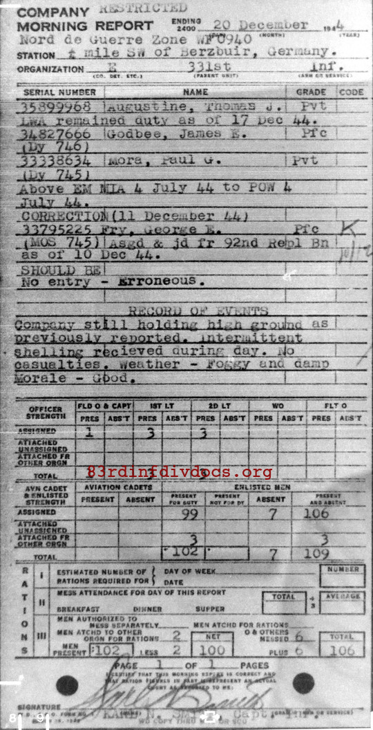 Company still holding high ground as previously reported. Intermittent shelling received during day. No casualties. Weather -- Foggy and damp. Morale -- good.